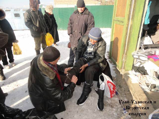 При Никольском храме Улан-Удэ бездомным раздают зимнюю одежду и обувь