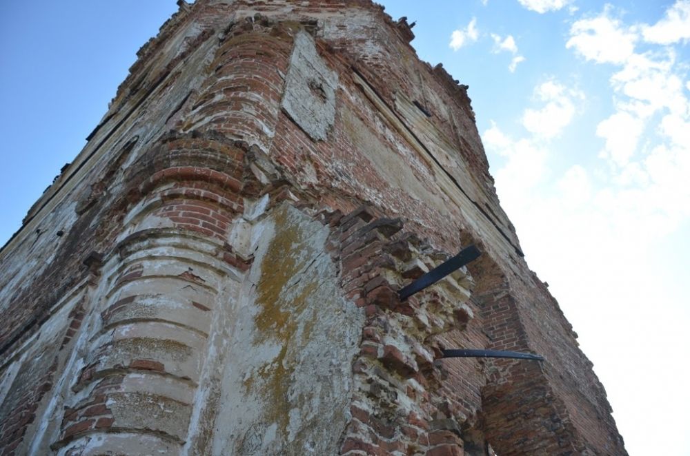 Храм был построен в 1809 году, а в 1929-м отнятую у верующих церковь начали использовать под зернохранилище. Сейчас от нее осталась только центральная часть, стоящая на хрупких кирпичных «ногах», образованных оконными проемами и проходом в трапезную. Здание находится в аварийном состоянии. В углах храма местные жители установили несколько икон.