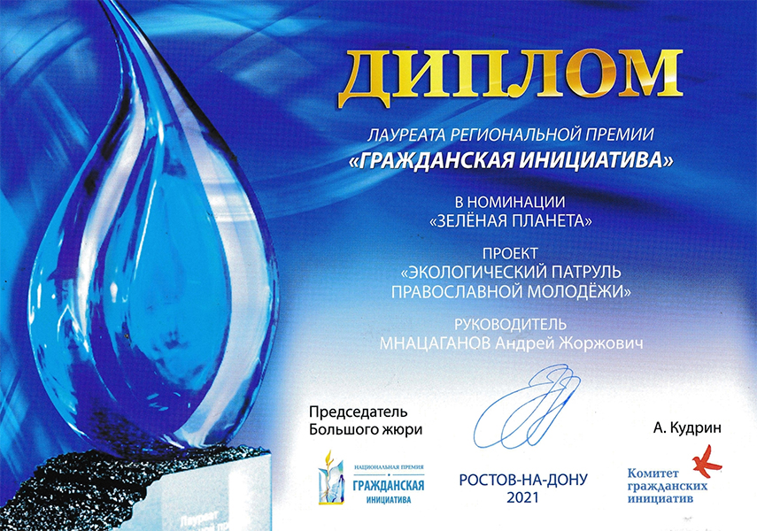 Приходы.ру. 08.11.2021. Проект «Экологический патруль православной молодежи» прихода святых Царственных страстотерпцев поселка Красный Сад Ростовской области победил на региональном этапе национальной премии «Гражданская инициатива». Награждение состоялось на камерной сцене Ростовского государственного музыкального театра 1 ноября.