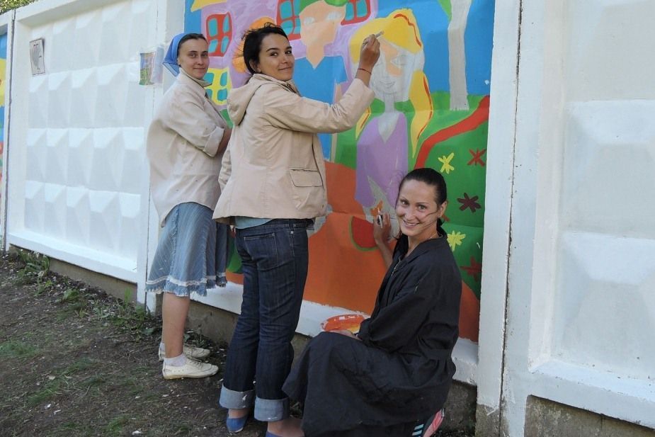 Вдоль пансионата расположен длинный и очень унылый бетонный забор из промышленных серых плит. Как объяснила сотрудница пансионата, как раз вдоль этого забора со стороны улицы и прогуливаются подопечные заведения. Активисты епархиального отдела решили покрасить секции через одну белым цветом, а оставшиеся пролеты разрисовать яркими красками. За сюжеты были взяты рисунки детей из лицея искусств им. С.П. Дягелева, а также часть эскизов из интернета.