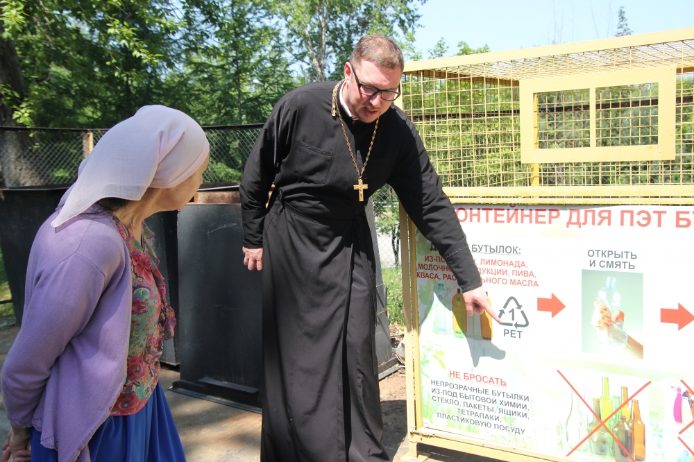 Приходы.ру 04.07.2023. 2 июля в Хабаровске возле храма во имя преподобного Серафима Саровского появился контейнер для сбора пластикового мусора. После воскресной литургии клирик Спасо-Преображенского собора священник Стефан Нохрин совершил молебен «о сохранении творения Божиего».