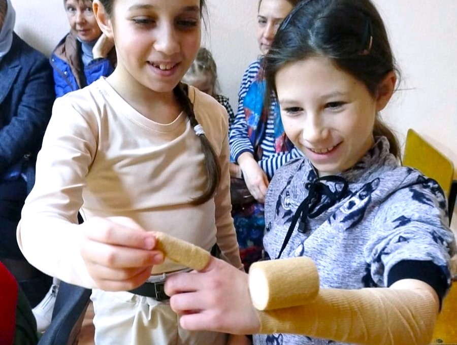 Были показаны приёмы наложения тугих повязок при различных ранениях, поддерживающего гипсового корсета при переломе. Участники узнали о практическом применении повязок и лангетов. Ученики и гости воскресной школы задавали вопросы о мерах предосторожности в различных ситуациях, о последствиях укусов животных, опасности посещения заброшенных нежилых мест и др.