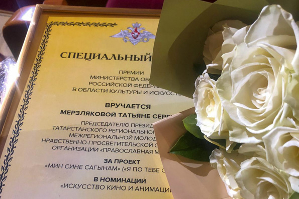 Специальный диплом премии за победу в номинации «Искусство кино и анимации» из рук первого замминистра обороны РФ Руслана Цаликова получила продюсер фильма, куратор социальной работы Серафимовского прихода Татьяна Мерзлякова. Дипломов удостоен весь авторский коллектив проекта, сообщает «Православие в Татарстане».