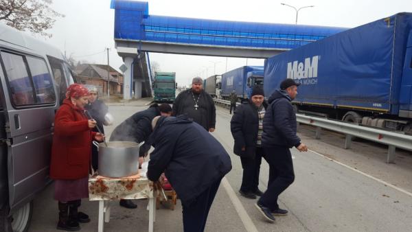 Очередь из грузовых автомобилей тянется от станицы Змейской в сторону границы с Кабардино-Балкарией, и, по словам священника Анатолия Голоднова, оставаться безучастными к проблеме этих людей невозможно, сообщает сайт Владикавказской епархии.
