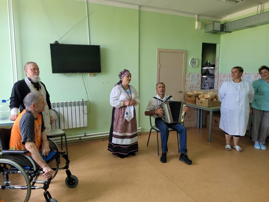 Священник благословил всех постояльцев, подарил каждому небольшую икону Пресвятой Богородицы, раздал пакеты со сладостями и фруктами, ответил на вопросы. Прихожане Сергей и Наталия порадовали пожилых людей небольшим концертом. Они исполнили песни под баян.