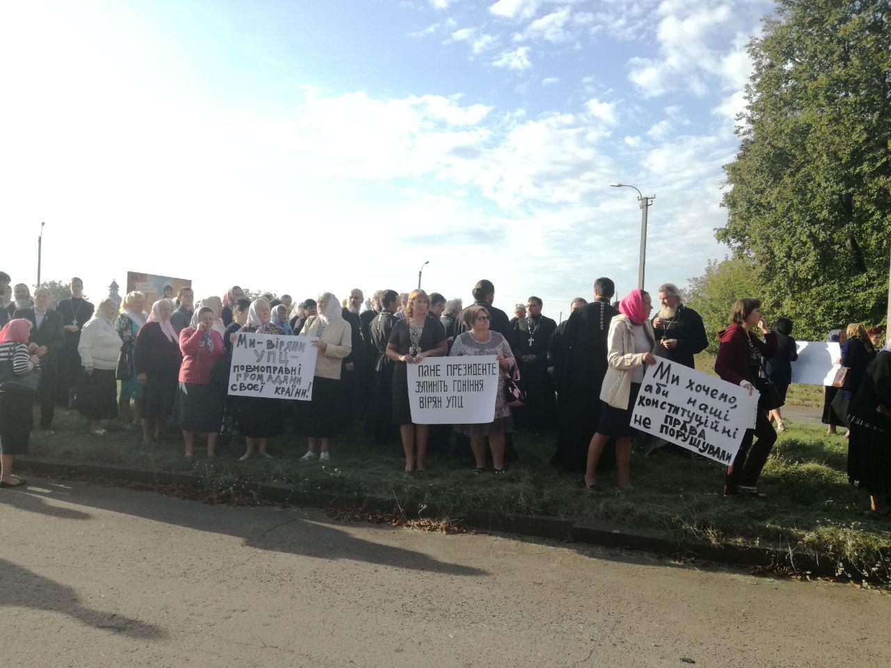 На встречу с президентом пришли в основном прихожане, пострадавшие от рейдерских действий ПЦУ в Ровенской области. В руках они держали плакаты, призывающие остановить гонения на каноническую Церковь и защитить конституционные права верующих: «УПЦ вне политики», «Церковь — это Дом Божий, а не арена для политических манипуляций», «Господин Президент, остановите гонения верующих УПЦ», «Мы — верующие УПЦ — полноправные граждане своей страны» и другие.