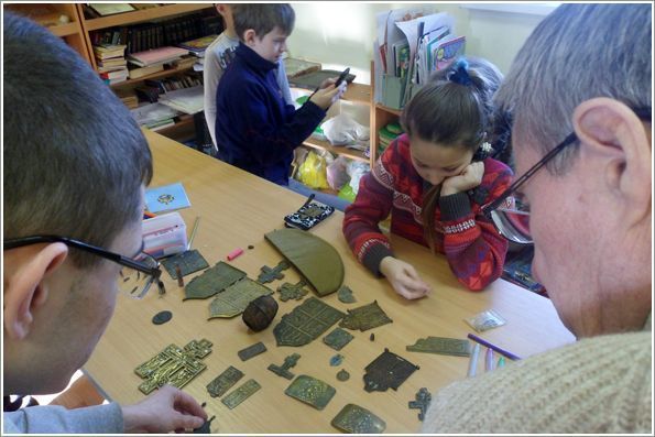 Перед началом выступления молодые люди разложили на столе находки: части складней, наперсные кресты, нательные крестики, пряжки солдат и офицеров российской императорской армии, литые иконы, трёхгранный штык от винтовки Мосина, наконечники стрел скифо-сарматского периода, обломок медальона солдата вермахта, немецкий знак за ранение, макет немецкой противопехотной гранаты, гильзы от немецкого карабина «Маузер», большой нательный крест, путевые и солдатские складни малого размера, немного монет различных периодов.