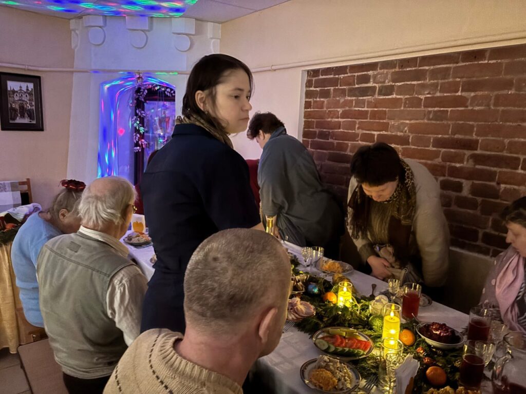 Кроме того, в рамках добрых дел святочных дней социальная служба храма после ночной и утренней Рождественских литургий организовала праздничные трапезы для детей из многодетной семьи, их родственников, приехавших на праздник из Белгородской области, а также окормляющихся в храме людей с инвалидностью – членов Тверского городского союза «Завет».