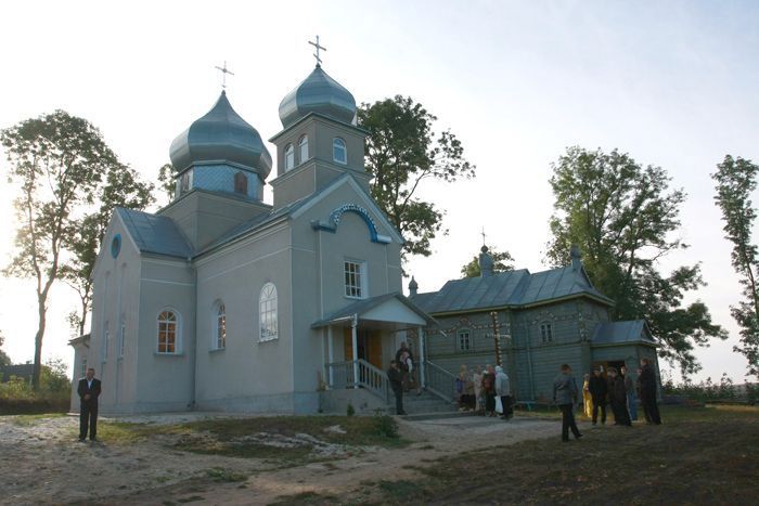 Покровский храм возводился на средства прихожан с 1996 по 2009 год. Храм строился рядом со старинной деревянной церковью XVIII века, в которой община УПЦ продолжала совершать богослужения. 15 ноября 2009 года раскольники совершили первую попытку захвата старинного храма. 30 ноября, под давлением областной и районной власти, община канонической Церкви согласилась совершать богослужения в новопостроенном храме, уступив старинную церковь «Киевскому патриархату».
