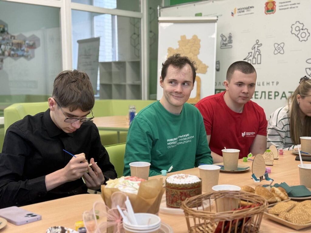 Встреча проходила за чаем с куличами. Для собравшихся также был организован творческий интерактив – молодые люди и священник расписывали деревянные пасхальные яйца.