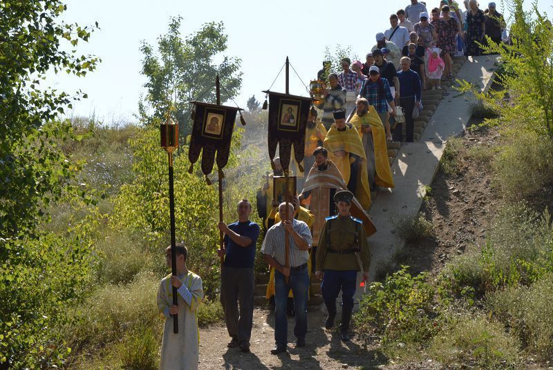 По окончании литургии от храма Преображения Господня верующие с иконами и хоругвями по пение молитвословий, обращенных к святым угодникам Божиим, направились к водоему. На протяжении всего торжественного шествия звучали запевы: «Пресвятая Троица, Боже наш, слава Тебе. Иисусе Сладчайший, спаси нас. Пресвятая Богородица, спаси нас. Святой равноапостольный великий княже Владимире, моли Бога о нас».