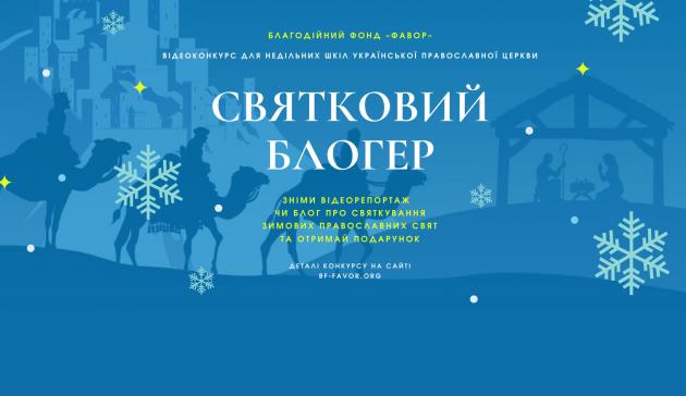 Приходы.ру. 22.12.2020. Всеукраинский детский видеоконкурс «Праздничный блогер» для воскресных школ Украинской Православной Церкви объявил благотворительный фонд «Фавор» 19 декабря. Участникам предлагается снять видео, посвященное православным зимним праздникам, и рассказать о своем приходе и воскресной школе. Работы принимаются до 1 февраля 2021 года, .