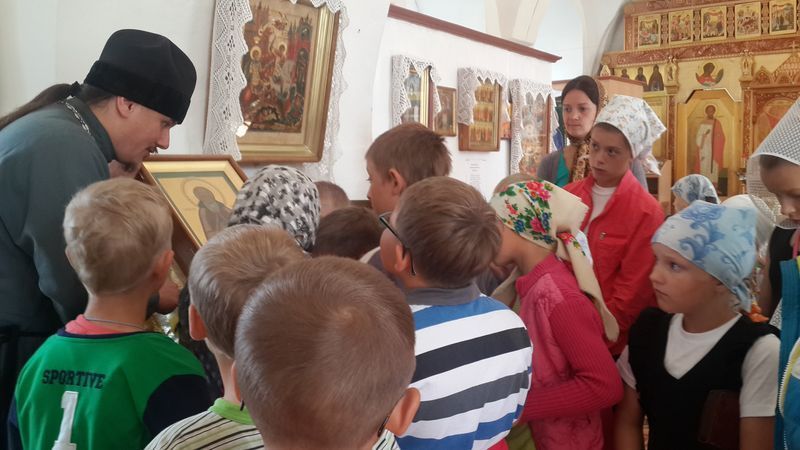По договоренности с руководством лагеря 23 ребенка в возрасте от шести до десяти лет из малообеспеченных, многодетных и неполных семей пришли в храм для ознакомления с культурой и обычаями Русской Православной Церкви на селе, сообщает сайт Вологодской митрополии.
