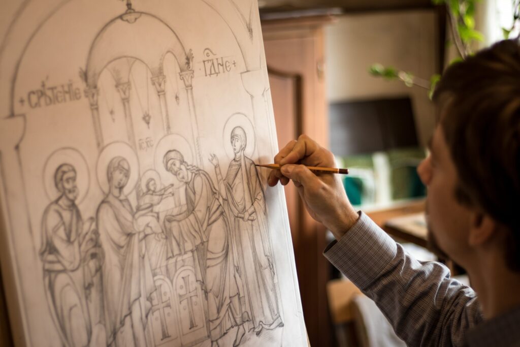 Иконописец школы во имя преподобного Алипия Печерского г. Дубны Московской области Мария Скуржинска рассказала прихожанам о первых иконописцах и истории возникновения икон. Она также показала, чем отличается иконография от классической живописи.