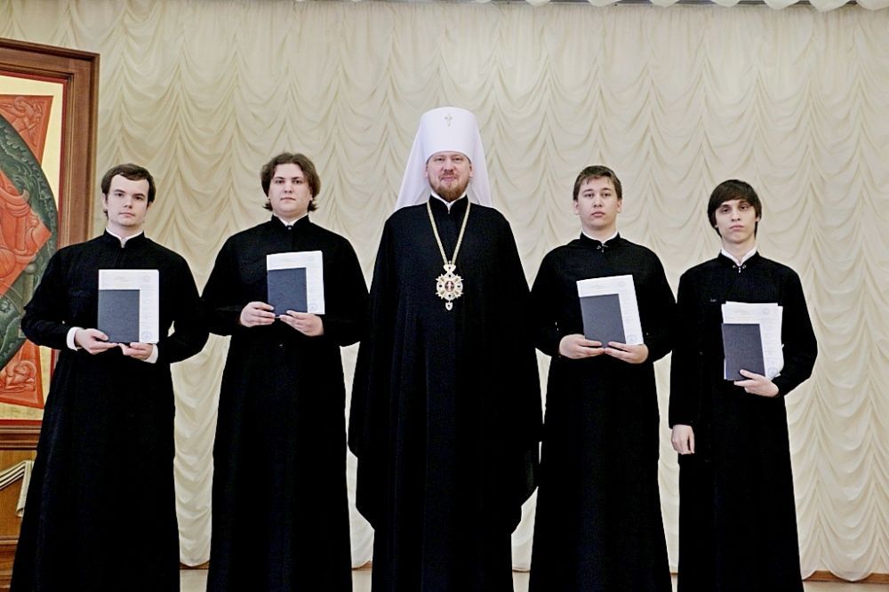 Это уже восьмой выпуск духовной школы. Выпускники получили дипломы из рук митрополита Владимира.