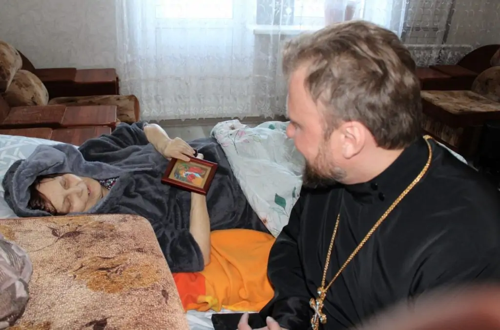 Водитель и фельдшер Березовской участковой больницы вместе со священником на носилках спустили пожилую женщину с пятого этажа, бережно погрузили в машину и отвезли в пансионат. Перед отъездом отец Павел побеседовал с ней и подарил икону Божией Матери.