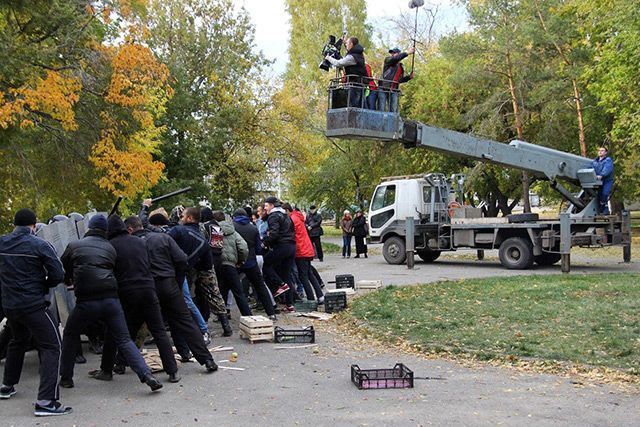 Проезжающие по автодороге вдоль городского парка, который находится сразу за зданием Оперного театра, 28 сентября стали свидетелями настоящего побоища: огромная толпа крепких молодых парней с палками и бейсбольными битами в руках налетела на цепь бойцов ОМОНа. Атака была яростной и кровавой, однако омоновцы, выставив щиты, жестко сдержали нападающих. Казалось бы, последним нужно отступить, разбежаться, но не тут-то было. Они лишь отошли на пару шагов, чтобы сосредоточиться, собраться силами и вновь пойти на приступ…. Стоп! В самую середину сражающихся молнией влетает человек с мегафоном, и сразу бой останавливается, омоновцы опускают щиты, нападающие на них люди из агрессивных отморозков превращаются во вполне себе нормальных людей. Все внимательно слушают… режиссера.