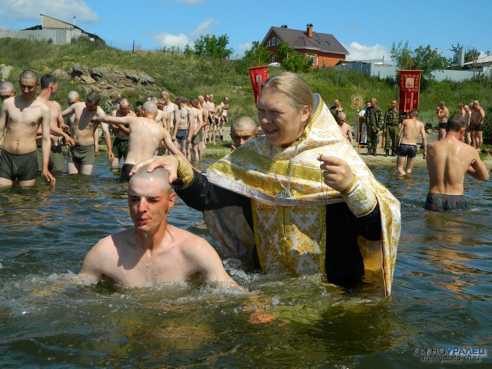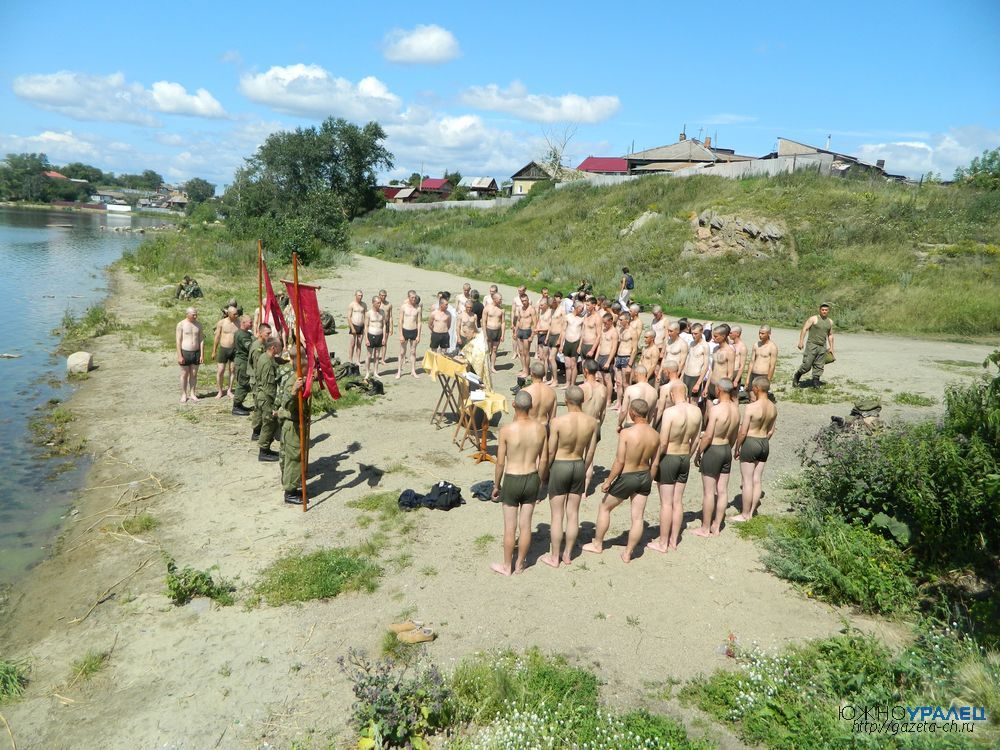 Молитвословия чина крещения совершались на берегу озера неподалеку от городского пляжа. Затем батюшки прямо в рясах вошли в воду, к ним подходили по очереди крещаемые. Солдаты трижды погружались в воды озера Чебаркуль – во имя Отца и Сына и Святого Духа.