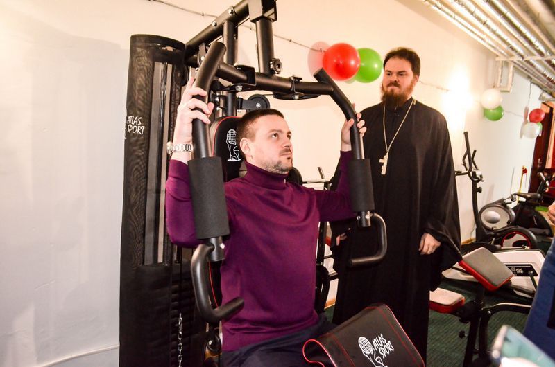 В приходской спортивной комнате есть гребной тренажер, велотренажер, многофункциональный тренажер на все группы мышц, стол для настольного тенниса и другое спортивное оборудование. Здесь могут бесплатно заниматься все горожане.
