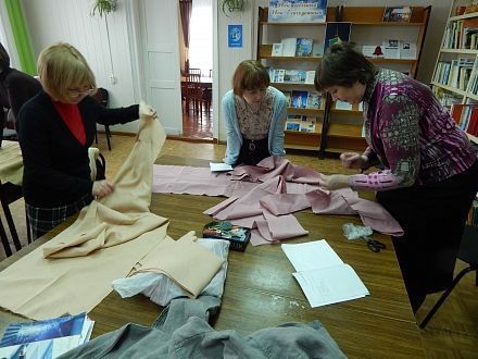 После теоретической части мастерицы приступили к практике. Наталья Денисова показала, как правильно кроить и шить средневековый карельский костюм, воссозданный по найденным на древних городищах элементам одежды племен весь и карела.