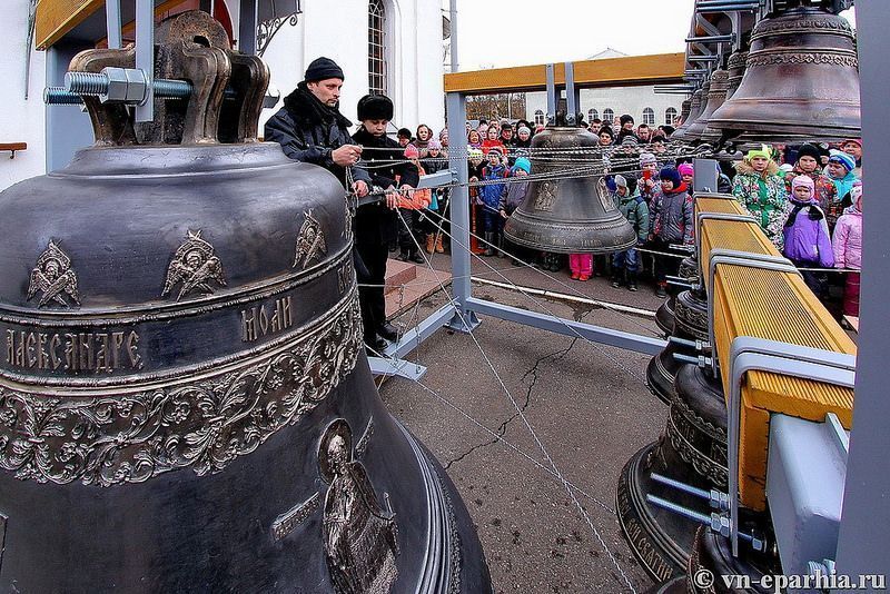 Освятил новые звоны 13 марта митрополит Новгородский и Старорусский Лев; затем был совершен праздничный звон во все колокола. Они были отлиты на Ярославском колокольном заводе в Тутаеве. Средства на изготовление колоколов были собраны силами прихожан храма, то есть «всем миром», сообщает сайт Новгородской епархии.