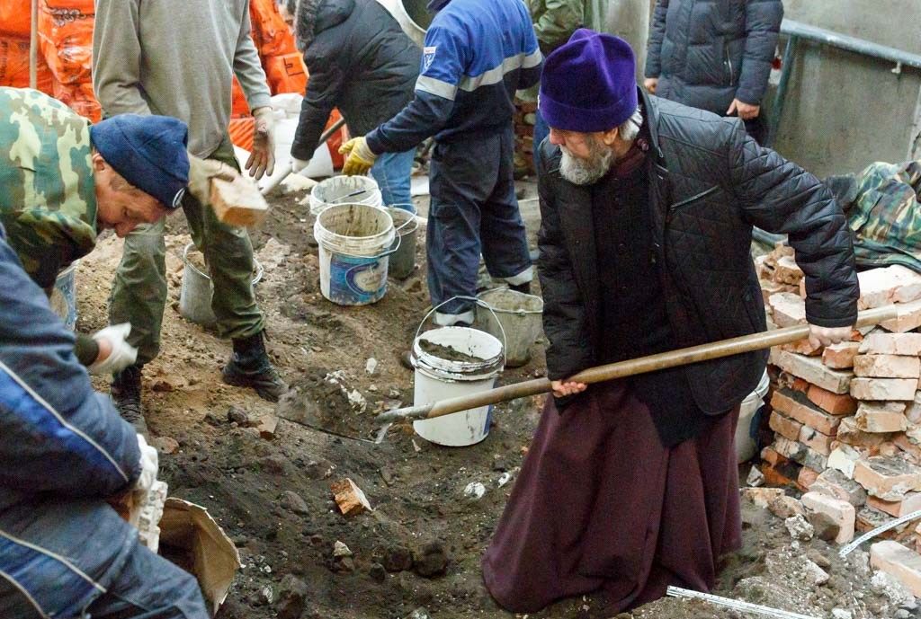 Как сообщает епархиальный сайт, по причине отсутствия в смете оплаченных работ выноса грунта при строительстве цокольного этажа, грунт из подвального помещения выносится силами омских казаков, священнослужителей и прихожан.