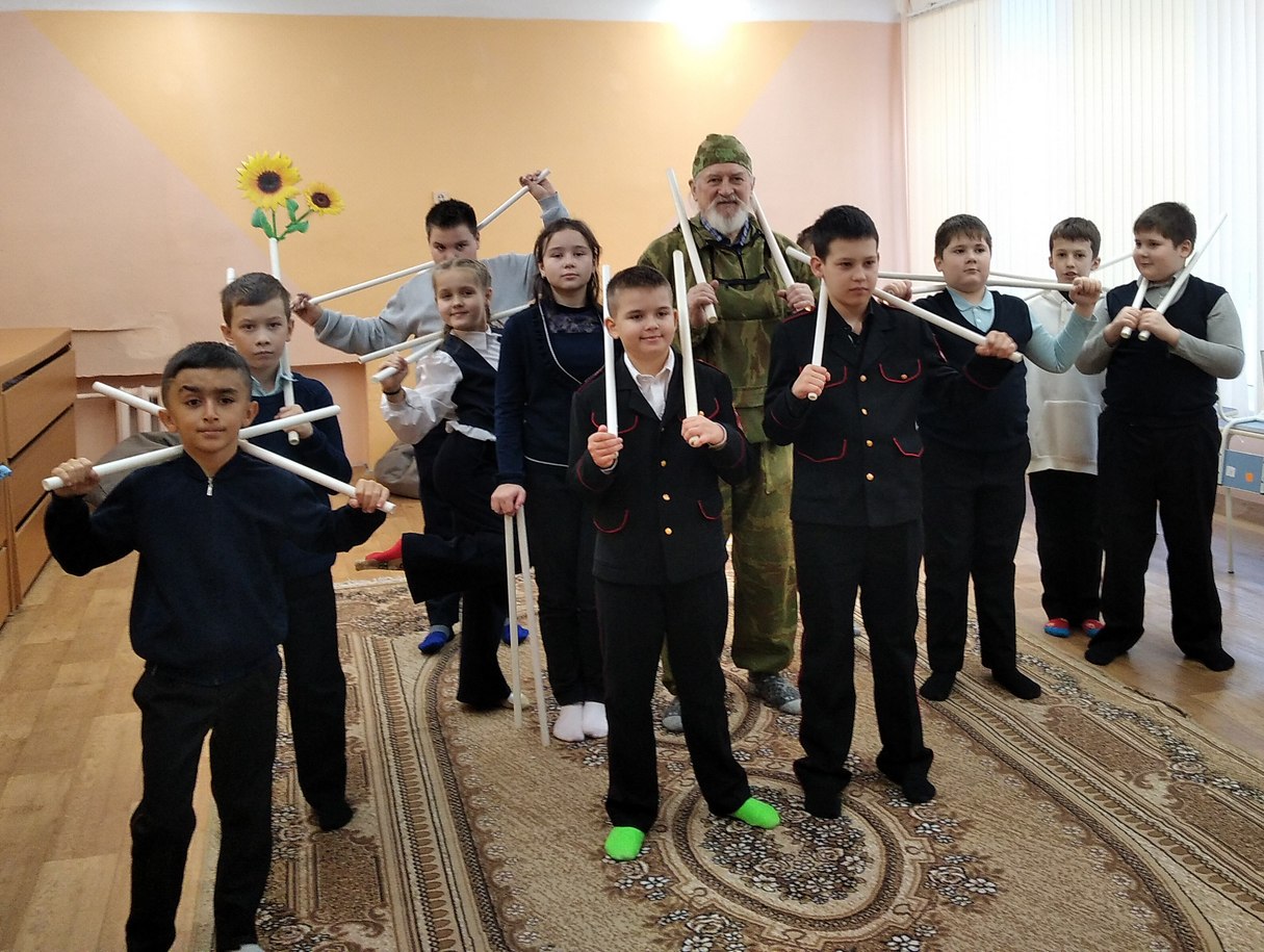 3А класс в этой школе не простой – он с казачьим уклоном, а умение владеть шашкой является важным качеством для казаков. Занятие с детьми проводилось с помощью специального инвентаря, имитирующего по своим размерам и весу казачье оружие.