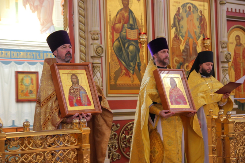 Из алтаря для общего поклонения были вынесены иконы новопрославленных святых, написанные в иконописной мастерской епархиального Петропавловского женского монастыря. При пении хором тропаря и величания верующих благословили святыми образами.