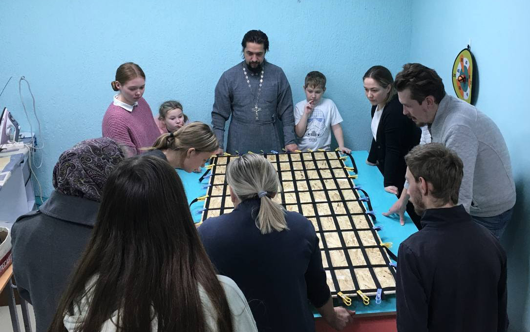 Уже через день добровольцы из числа духовенства, молодежного движения «Кифа» и прихожан храмов города Бирска собрались в швейной мастерской епархии, чтобы подготовить оснащение для пошива носилок. Мужчины изготовили столешницу для сборки, женщины занимались разметкой и нарезкой строп. После подготовительных работ все участники собрали каркас будущих носилок для пошива.