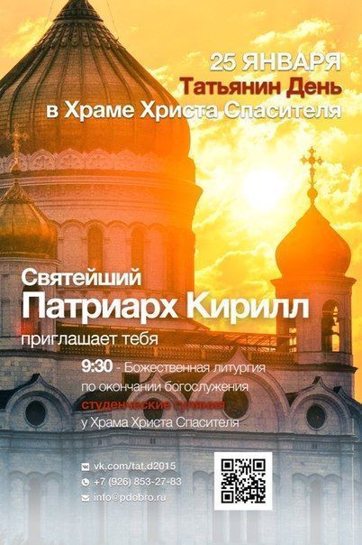 Начало богослужения в 9.30. По окончании литургии возле Храма Христа Спасителя пройдут студенческие гуляния, сообщает группа мероприятия в социальной сети «ВКонтакте».