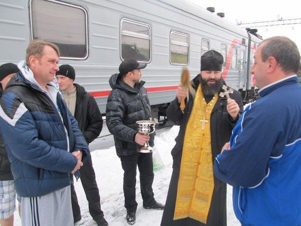 Отец Георгий пообщался с беженцами на перроне, вручил собранное, ответил на вопросы, окропил путешествующих в вагоне святой водой, сказал беженцам напутственные слова и благословил группу.