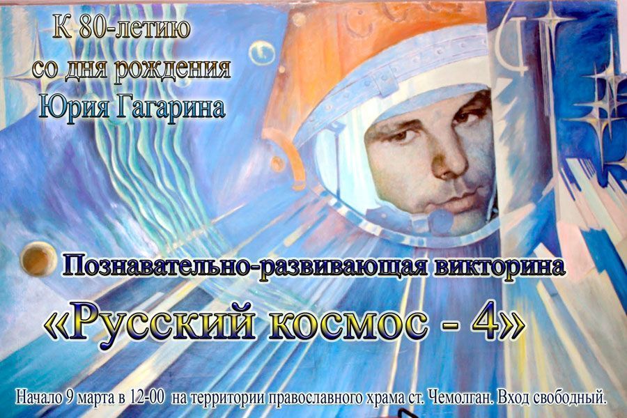 К 80-летию со дня рождения в мире первого космонавта Юрия Алексеевича Гагарина (он родился 9 марта 1934 года) на приходе в честь Владимирской иконы Божией Матери станции Чемолган состоится познавательная викторина, сообщает приходской сайт.