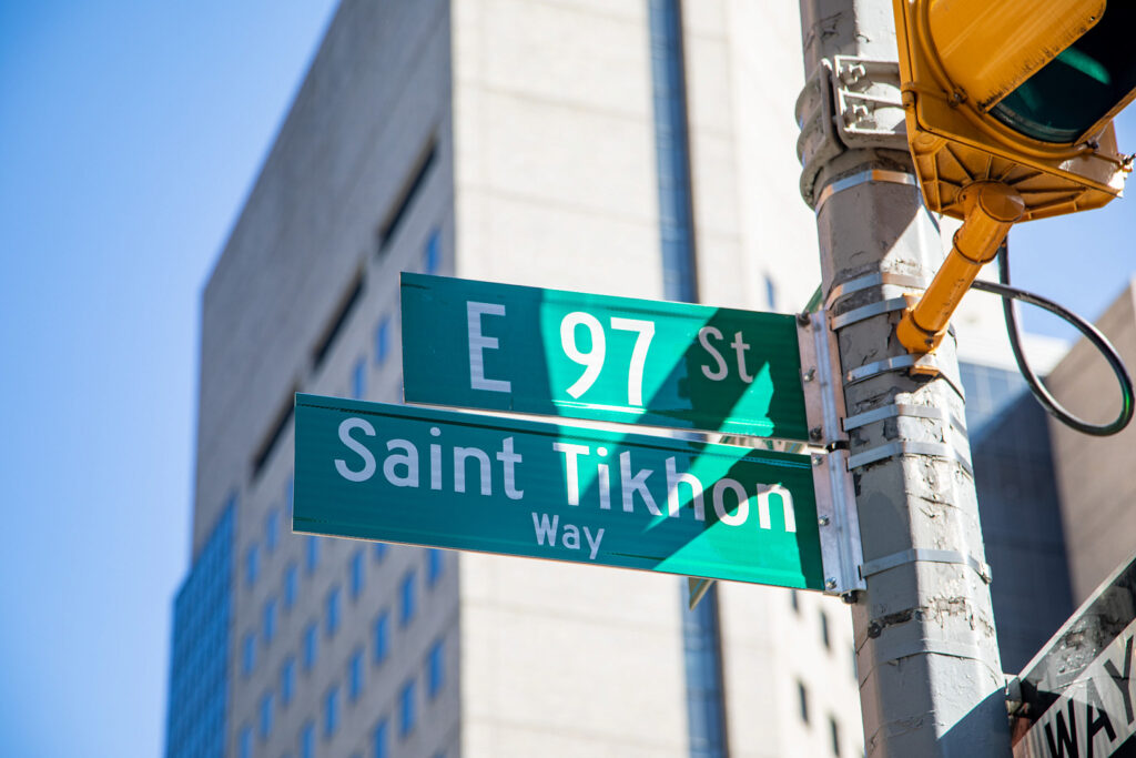Приходы.ру 11.10.2022. Участок улицы на Манхэттене в Нью-Йорке, где расположен кафедральный Николаевский Патриарший собор, переименовали в честь святителя Тихона, Патриарха Московского. Открытие дорожного указателя «Saint Tikhon Way» на перекрестке Мэдисон-авеню и 97-й Восточной улицы состоялось 7 октября, в 228-ю годовщину учреждения Православной миссии на Северо-Американском континенте.