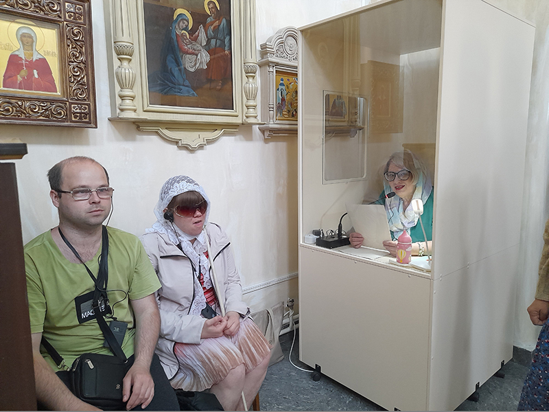 Тифлокомментатор Екатерина Ренер подробно рассказывала своим подопечным, как идет богослужение, как выглядит храм снаружи и внутри, в каких одеждах сегодня священник и что за праздник отмечается, как и о чем поют певчие. Она подсказывала, в какие моменты надо осенить себя крестом, выслушать молитву стоя.