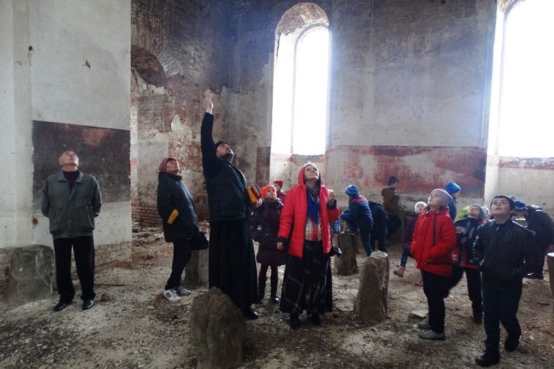 Полуразрушенная церковь во имя святителя Василия Великого находится на окраине этого села. Детей на место проведения урока доставили на машинах неравнодушные прихожане.