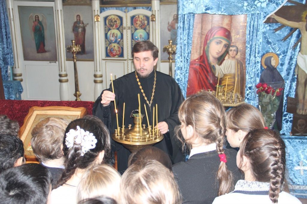 В ходе беседы иерей Вадим Татусь познакомил детей с житием преподобного Сергия Радонежского и святителя Николая Чудотворца. Священнослужитель с отеческой любовью рассказал поучительную для детей историю о цепочке добрых дел, которая не должна прерываться, и в благословение всем учащимся подарил ребятам иконы Покрова Пресвятой Богородицы.