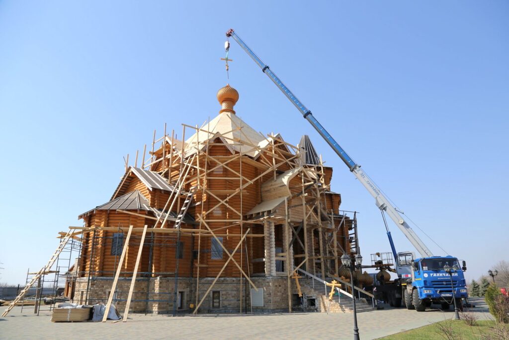 Строящийся деревянный Благовещенский храм в городе Горловке на Донбассе увенчался куполами. Накупольные кресты и купола, которые смонтированы из лемеха, были освящены еще год назад в праздник Благовещения Пресвятой Богородицы, однако возможность поднять их на храм появилась только сейчас.