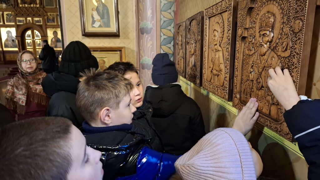 Экскурсовод Екатерина Маяцких рассказала историю появления храма и объяснила его устройство, познакомила с образами Спасителя, Богородицы и святых. Взрослые и дети с ограничениями по зрению смогли «увидеть пальцами» восемь тактильных икон, расположенных в храме, и поклониться этим святым образам.