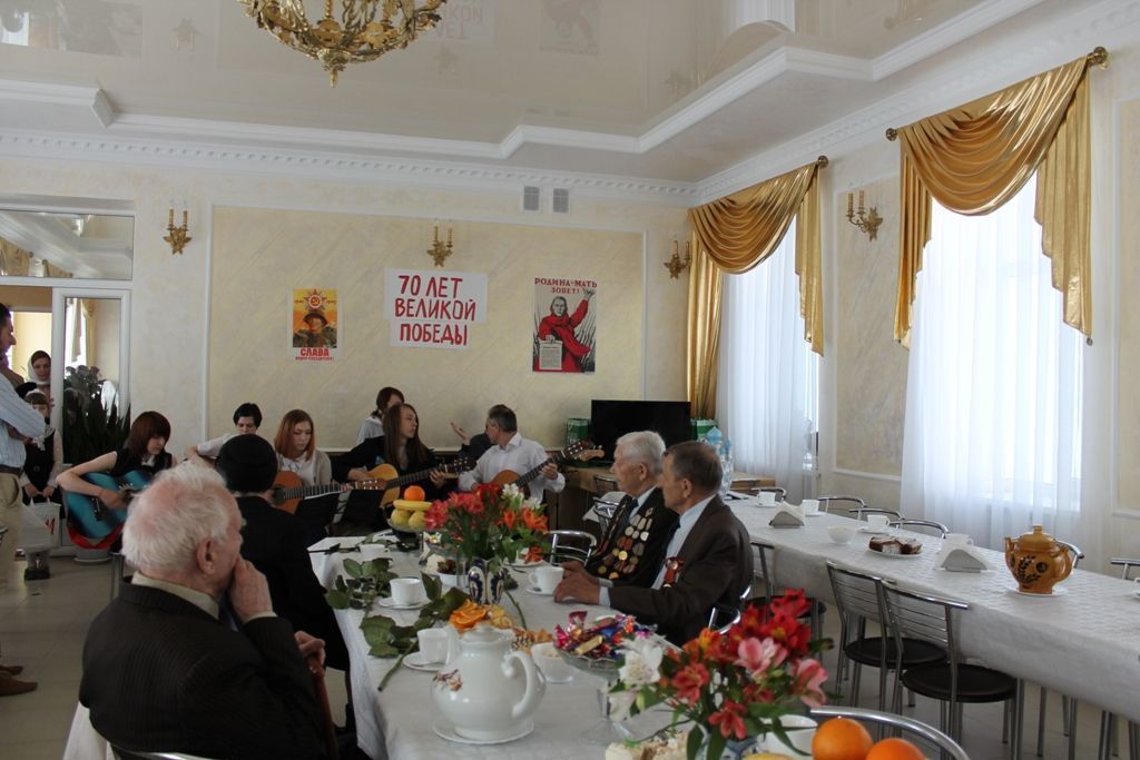 В дружественной обстановке за чашкой чая студенческая молодежь радовала стариков чтением стихотворений собственного сочинения, пением военных песен. Свою лепту в украшение праздника привнесли и воспитанники приходской школы, исполнив для ветеранов песню «Катюша» и прочитав стихотворения о Великой Победе. Участники ансамбля акустической гитары «Созвучие» порадовали виновников торжества исполнением замечательных музыкальных композиций.