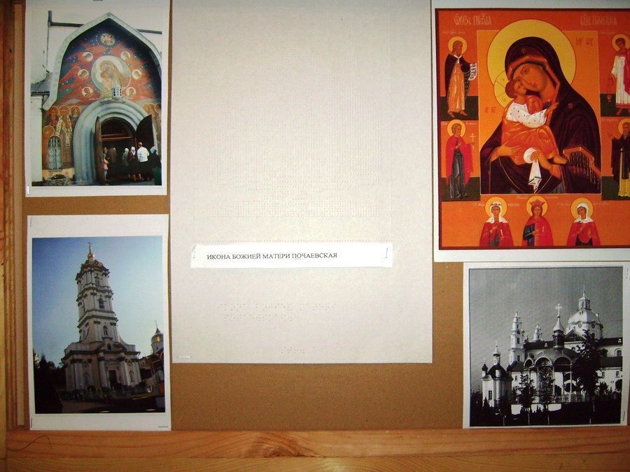 В экспозиции, которая на один день развернется в Стефановском пределе Успенского собора, собраны иконы и картины, нанесенные на бумагу точечным способом для тактильного восприятия пальцами. Сюжет многих из них отображает библейские события, когда по усердным молитвам Господь дает слепым зрение. Будут представлены образа Пресвятой Богородицы, иконы слепой с рождения блаженной Матроны Московской, потерявшего зрение на склоне лет святителя Луки (Войно-Ясенецкого) и других угодников Божиих, а также истории из житий многих святых.