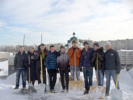 26 марта после того, как вследствие разгула стихии в городе выпало большое количество снега, ряд учащихся  откликнулся на призыв помочь в уборке от снега крыши цокольного этажа строящегося храма. Студенты из группы Т-1-12, которые в будущем будут заниматься техническим обслуживанием и ремонтом радиотехнического оборудования, пришли вместе с преподавателем спецдисциплин Татьяной Чекрыжовой.