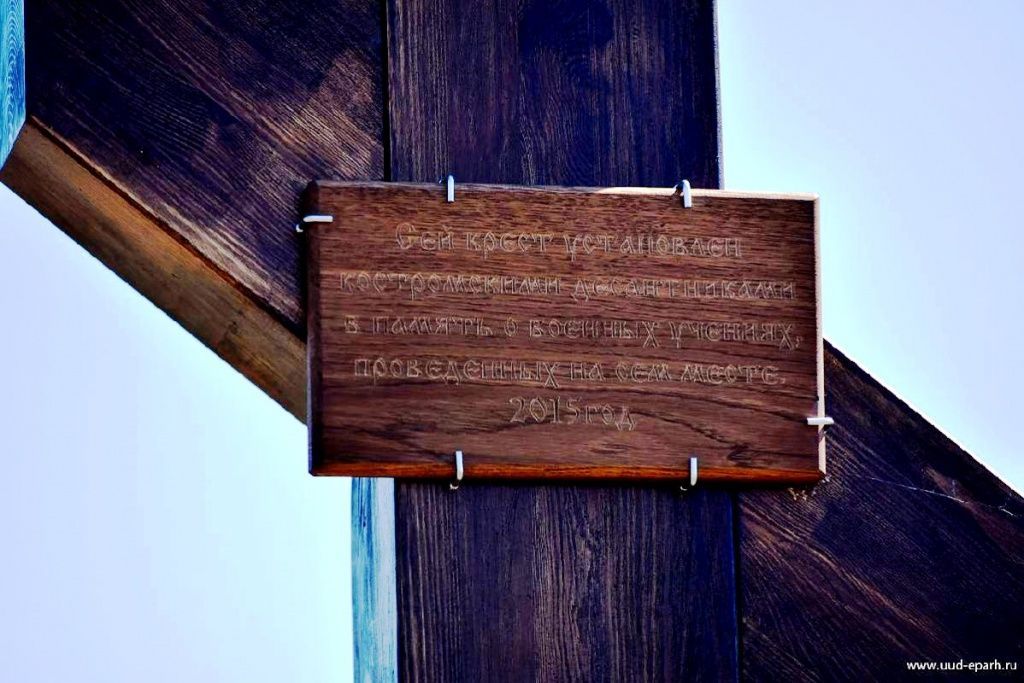 Памятная табличка гласит: «Сей крест установлен костромскими десантниками в память о военных учениях, проведенных на сем месте. 2015 год».