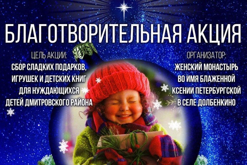 Подарки будут вручены детям из многодетных и неблагополучных семей, воспитанникам социальных учреждений Дмитровского района Орловской области на рождественском утреннике, который ежегодно организует монастырь Ксении Петербургской.