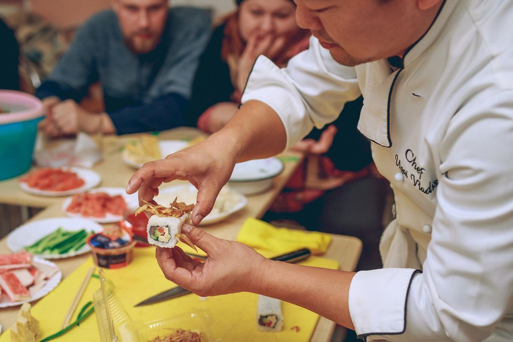 Участники Молодежного совета Шахтинской епархии и молодые прихожане Покровского кафедрального собора узнали много интересного не только о тонкостях изготовления суши и роллов, но и об особенностях японской кухни вообще и традициях страны восходящего солнца. Участники мастер-класса смогли задать интересующие вопросы и попробовать разнообразные роллы из натуральных ингредиентов в исполнении шеф-повара. Самые любознательные приняли участие в процессе их изготовления.