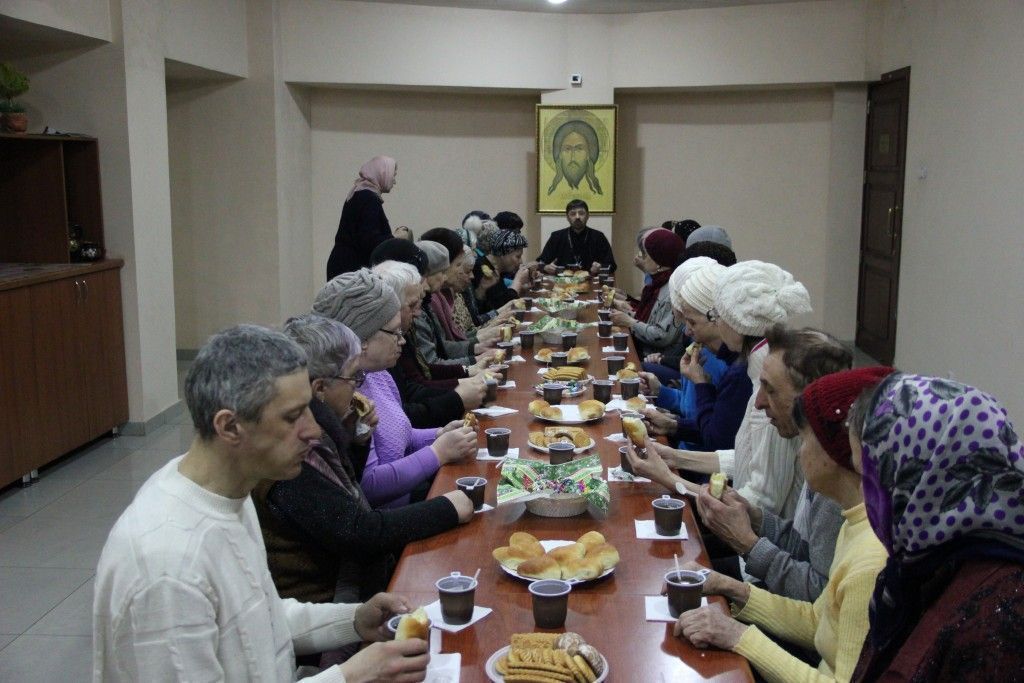 Маршрут здоровья для 34 человек завершился экскурсией по храму преподобного Серафима Саровского и беседой с протоиереем Виталием Кудрей на тему: «Улыбка: святость или страстность», которая прошла за чаепитием с пирогами, приготовленными в приходской трапезной.