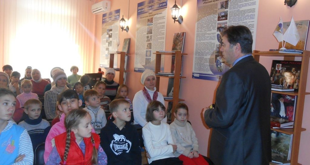 Научный сотрудник музея Владимир Вишневский представил детям виртуальную экскурсию по Русскому музею Санкт-Петербурга. Отличительной ее особенностью является использование специальных технологий, позволяющих «озвучить» картины для зрителей.