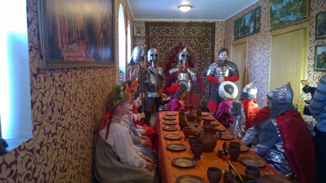 Затем гости очутились в помещении исторической реконструкции XVI века, которое было устроено сотрудниками прихода по картинам и литографиям русских художников. Ребята познакомились с бытом и воинскими традициями Руси, посмотрели и подержали в руках доспехи и оружие. Мальчики переоделись в исторические костюмы княжеской дружины Руси, девочки надели сарафаны. Детям было предложено мысленно перенестить во времена Дмитрия Донского. Будущие защитники Отечества в доспехах и костюмах русского воинства готовились «отправиться на ратный бой», а красные девицы «провожали воинов на войну».