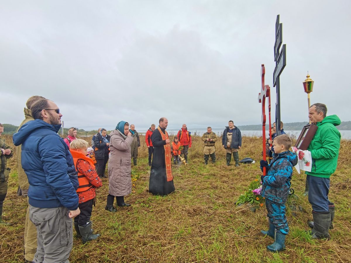 С пристани Лявли совершили переход на катерах на остров Ельничный. Известно, что там в 1920-е годы расстреливали заключенных Холмогорского концентрационного лагеря. Сейчас на острове установлен поклонный крест, возле которого совершил заупокойную литию священник Михаил Ситников.