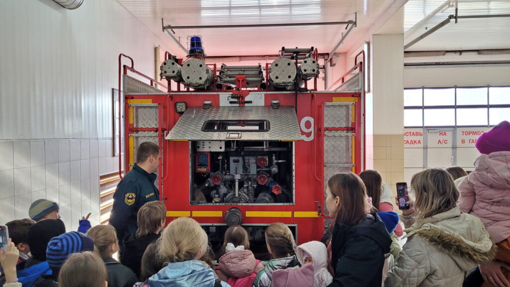 Сотрудник пожарной части показал участникам экскурсии гараж боевых машин. Он подробно рассказал о назначении каждого предмета. Все желающие смогли посидеть в кабине, подержать пожарный рукав и потушить условное возгорание. Юные прихожане изучили схему действия дежурной бригады — от вызова по телефону до выезда на тушение пожара. В конце инструктажа экскурсовод продемонстрировал, как пожарный расчет готовится к выезду.