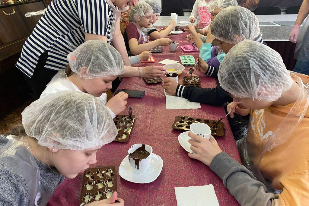 Детям рассказали историю появления шоколада и секреты изготовления сладостей. Под руководством наставников участники мероприятия заливали в специальные формочки шоколад и делали фруктовые конфеты, обмакивая кусочки фруктов в растопленный шоколад. Плоды своих трудов юные кондитеры попробовали за чаепитием, сообщают «Хибины».